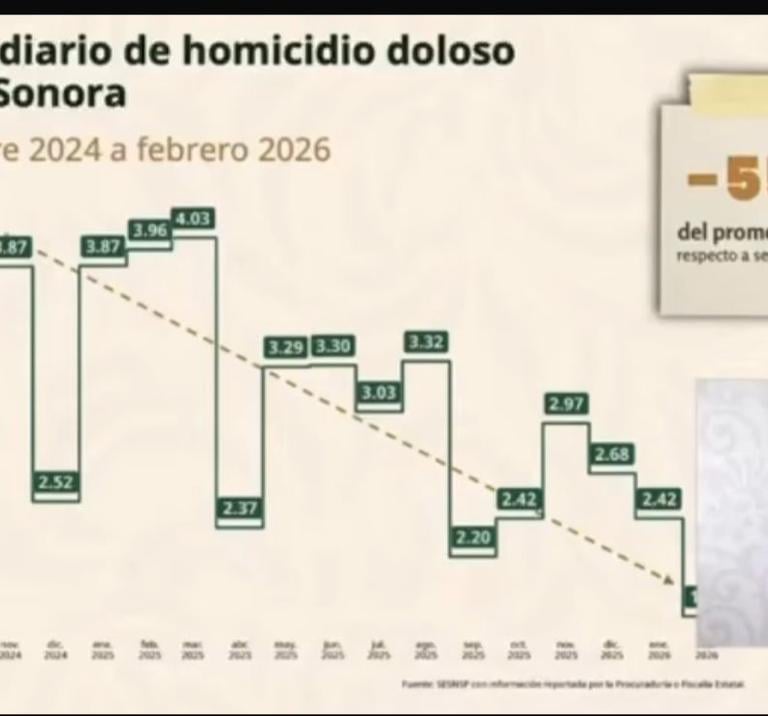 En la conferencia matutina de la presidenta Claudia Sheinbaum Pardo, la titular del Secretariado Ejecutivo del Sistema Nacional de Seguridad Pública (SESNSP), Marcela Figueroa Franco, informó que en el promedio diario de homicidios dolosos, Sonora pasó de 4.1 casos en septiembre de 2024 a 1.86 en febrero de 2026. Crédito: Telemax