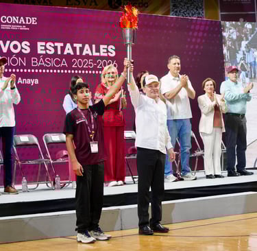 Con el objetivo de promover la sana convivencia, el espíritu de competencia, el respeto, y los valores fundamentales entre las y los estudiantes, el gobernador Alfonso Durazo Montaño junto a Angélica Noemí Juárez Pérez, subsecretaria de Educación Básica de la SEP, inauguró los Juegos Deportivos Estatales Escolares de la Educación Básica 2025-2026 edición “Dra. Margarita Lomelín Anaya”. Crédito: Telemax
