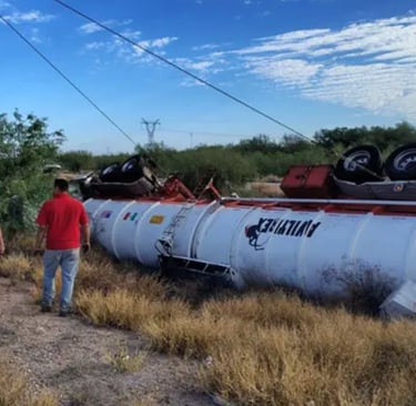 na pipa cargada con combustóleo volcó en la Carretera Federal 15, a la altura del tramo conocido como "La Jaula" en Navojoa. Este incidente representó el tercer accidente carretero con derrame o riesgo de sustancias químicas en el estado de Sonora en un lapso de cuatro días. Crédito: Expreso